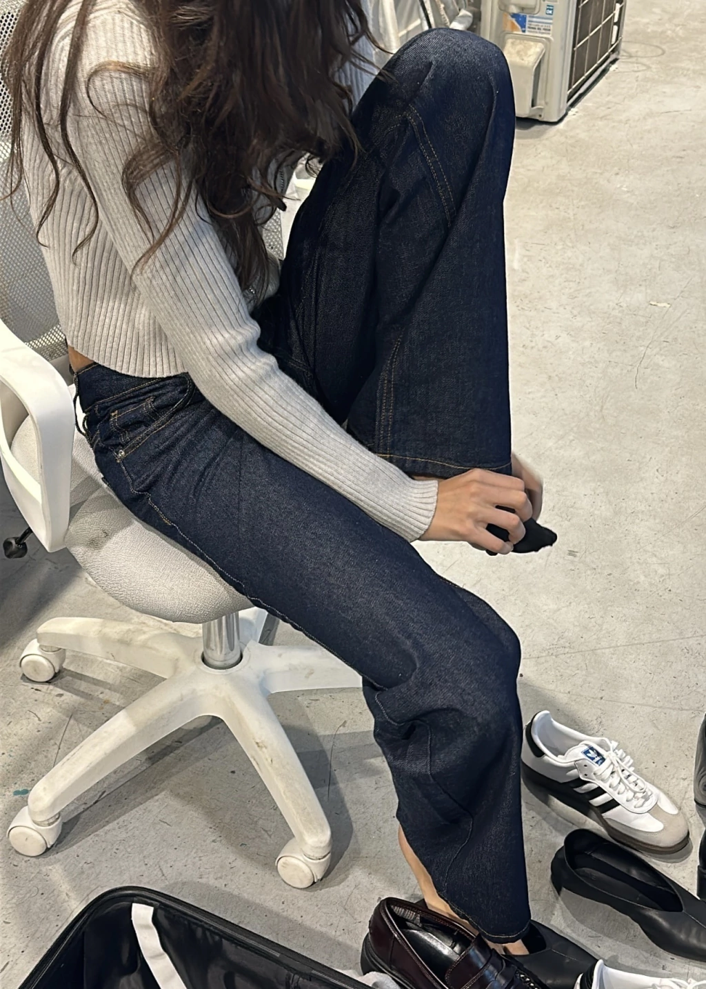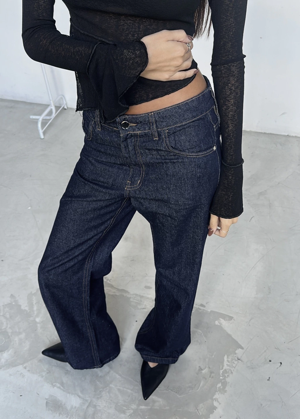 Jean oscuro color denim original (sin lavado), con costuras color beige.